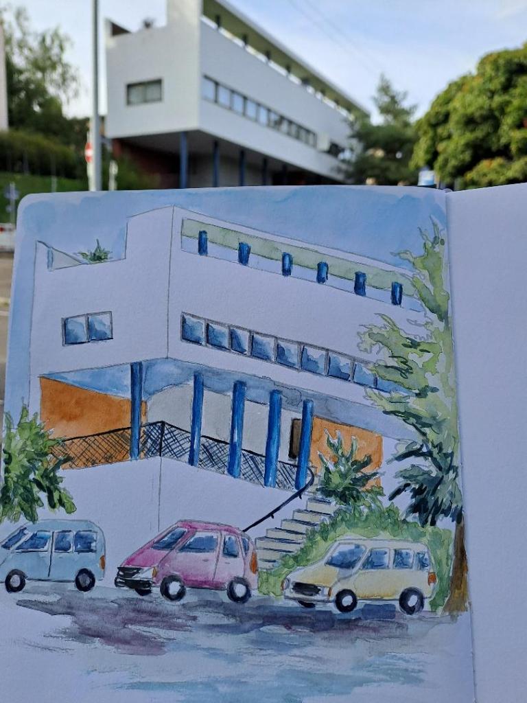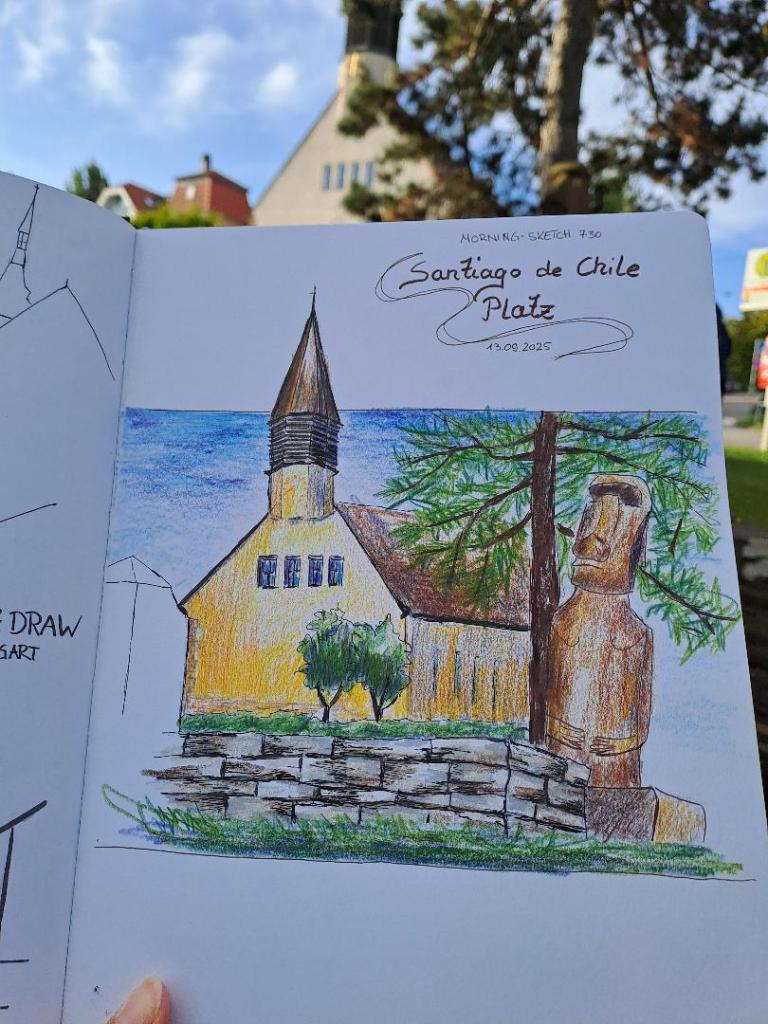 Tja, da hat sie vermutlich recht, ich kann das mit mehr Zeit und am gemütlichen Schreibtisch besser. Dazu noch Radiergummi, um Fehler zu korrigieren. Aber genau das macht Urban Sketching aus: die Imperfektion, der schnelle und ungerade Strich, der Klecks, der da eigentlich gar nicht hingehört. Mir verrutscht regelmäßig die Perspektive, weil mein Kopf mir Streiche spielt. Danach ärgere ich mich kurz, mach nen schönen Rand herum und akzeptiere meinen „Fehler“ als persönliche Note meines künstlerischen Ausdrucks😊